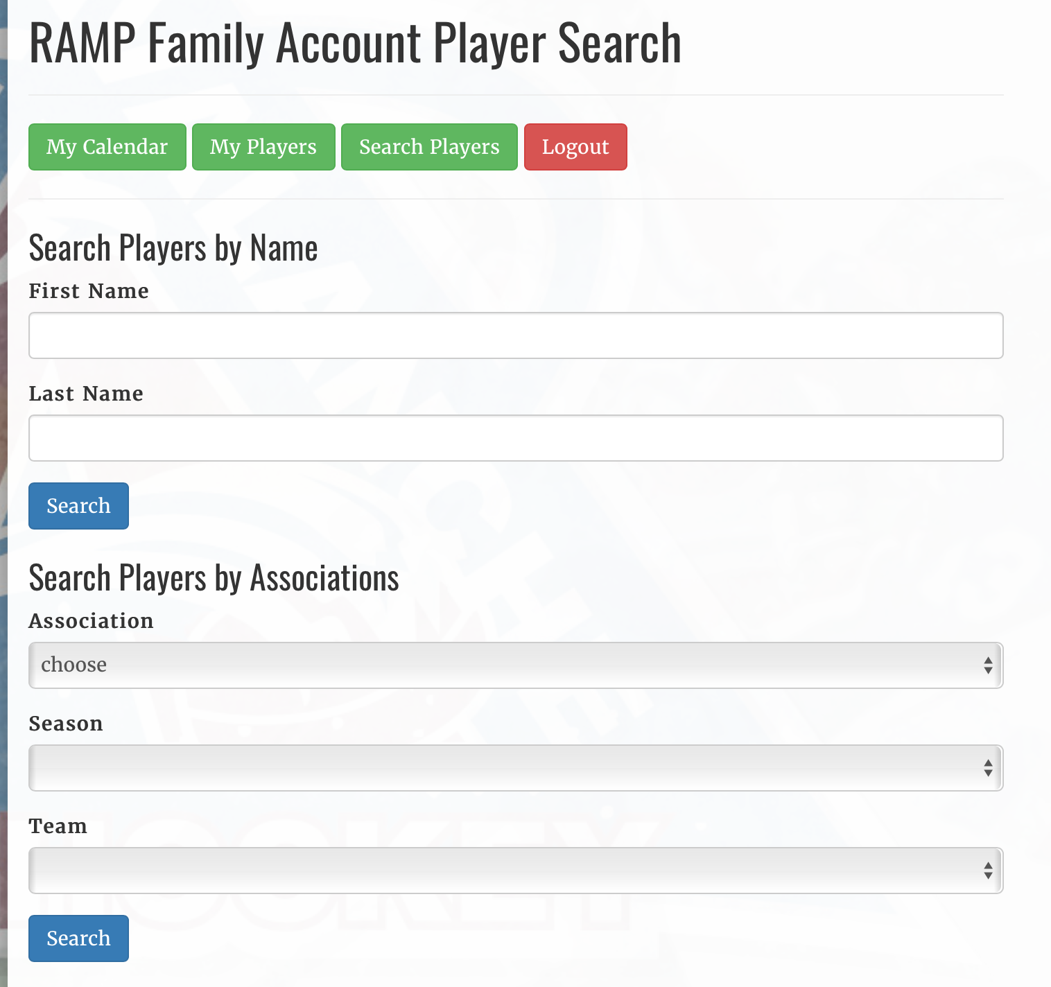 3. Once you are logged in to RAMP, you must search for your player in the website database. You may do this by clicking the "Search Players" button. You may search for your player by name, or by association. If you are not able to find your player using either of these options, it is likely because your team coach or manager has not uploaded the team roster yet. If this happens, contact your coach or team manager to find out whether they have uploaded the team roster. Be advised that this search may return results containing players from across the country. Make sure you confirm the association is accurate as well as the player name.